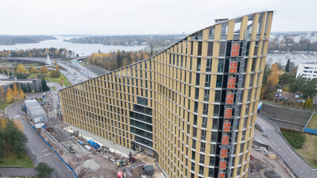 ”Heti työmaan alussa huomattiin, että se sijoittuu liikenteen haastavaan solmukohtaan Kehä ykkösen viereen ahtaaseen tilaan. Kun rakennuksen räystäskorkeus nousee yli 50 metriin, on yhdistelmä melko haastava”, Ruokonen kertoo.