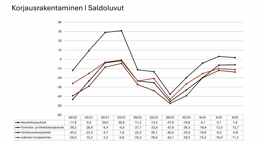 Korjausrakentamisen tilanne ei ole merkittävästi muuttunut keväästä 2025. Asuntokorjausten kehitystä ennakoiva saldoluku on aavistuksen positiivinen, mutta muilla osa-alueilla korjausrakentamisen lasku jatkuu. Kokonaisuutena korjausrakentamisen kasvuodotukset ovat olleet miinusmerkkisiä koko 2020-luvun. Korjausvelan jatkuva kasvu on kuin aikapommi, jonka seuraukset lankeavat lopulta osakkaiden, kuntien ja valtion maksettaviksi.